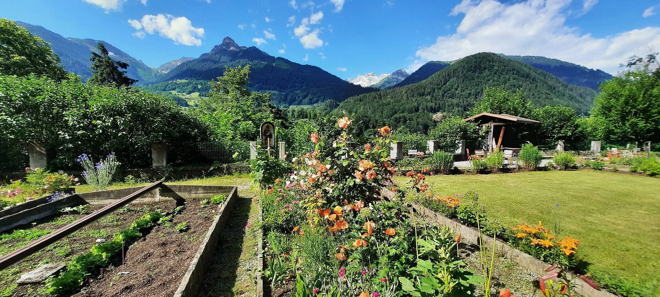 Ein besonderer Punkt ist der große Klostergarten mit seiner Blumenpracht, der unter Aussparung eines Bereichs für die Schwesterngemeinschaft offen zugänglich ist.